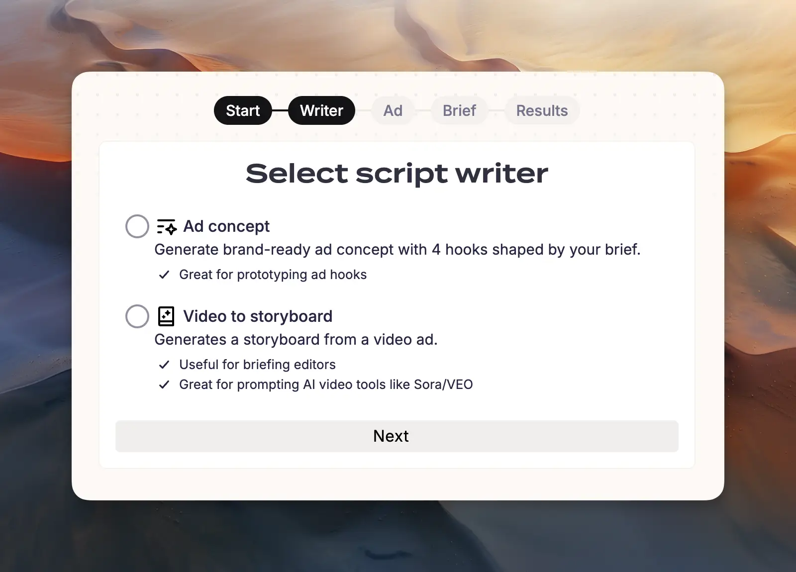 Swipekit’s AI Scriptwriter turns inspiration into action by helping you create ready-to-launch ad ideas in minutes — all based on your existing ad library and brand brief.