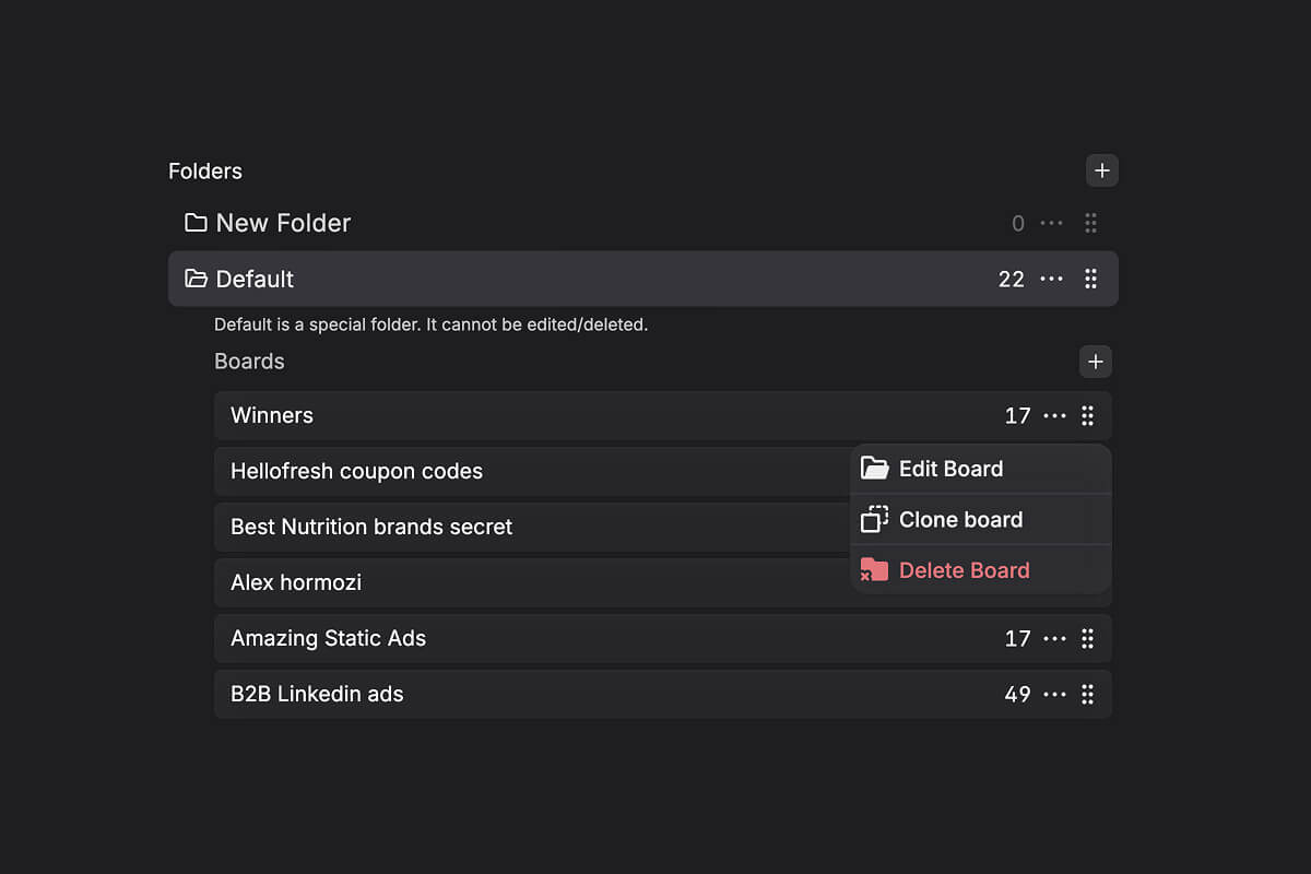 Organize by how you think. Create boards for UGC hooks, testimonials, offer stacks, landing pages, or anything else your workflow needs.