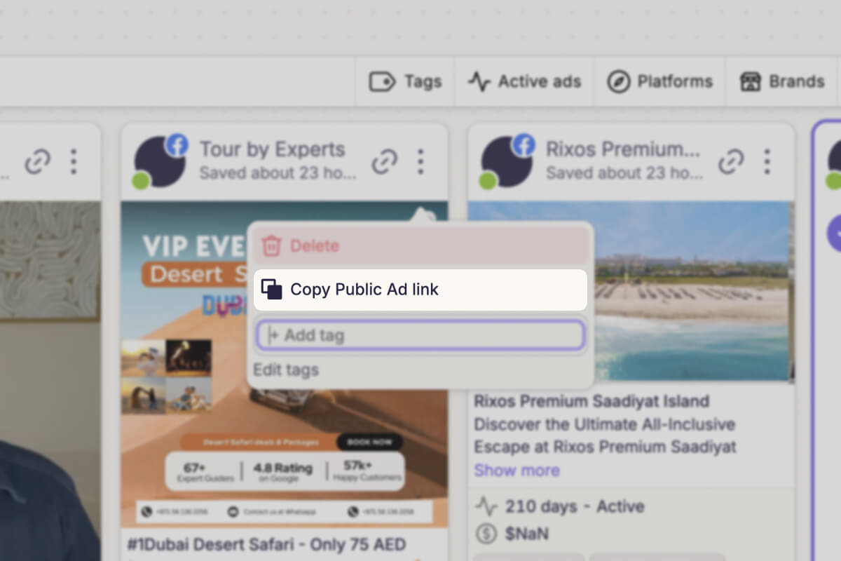 Share individual ads publicly. Send one ad link to a creator and they instantly understand the hook, structure, and tone.